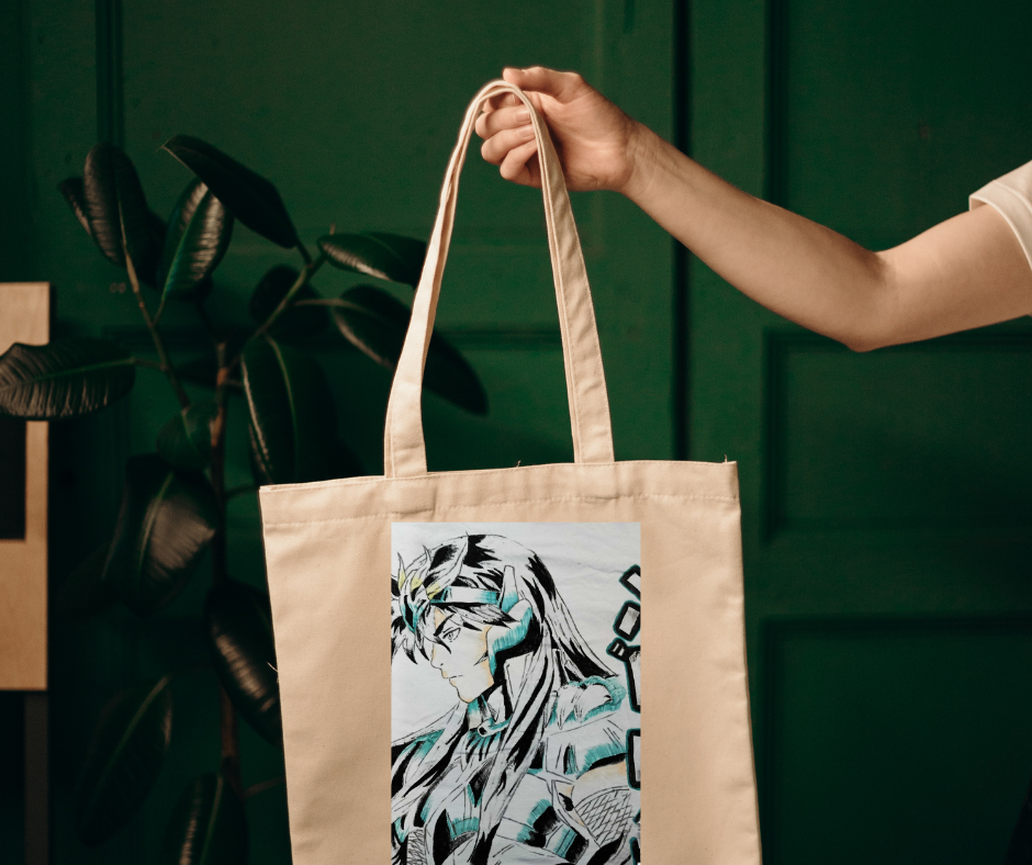 Esta bolsa de tela exclusiva de Artenime incorpora una ilustración anime estilo sketch inspirada en un caballero del zodiaco, destacando por su trazo artístico, su estética sobria y su carácter visual elegante.