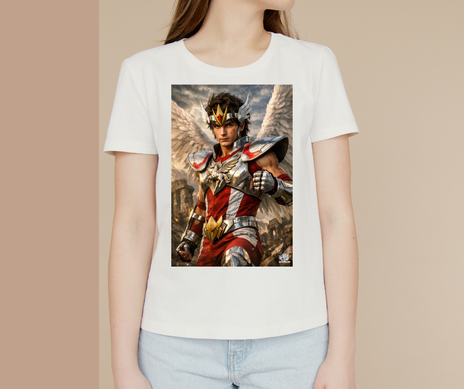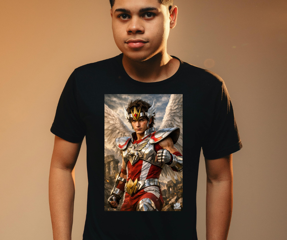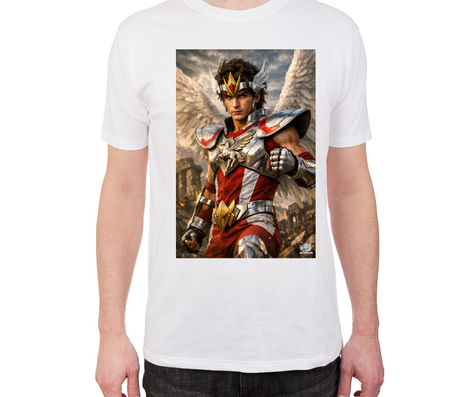 Esta camiseta exclusiva de Artenime presenta una ilustración anime realista del caballero del Pegaso, reinterpretado con un alto nivel de detalle artístico y una estética épica y elegante.