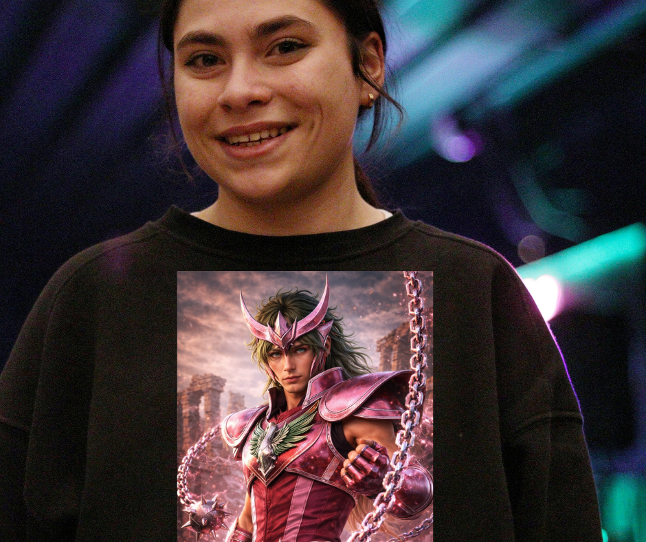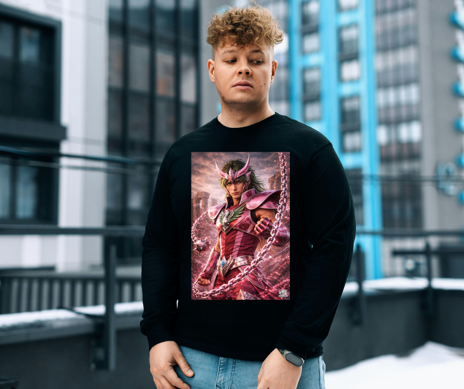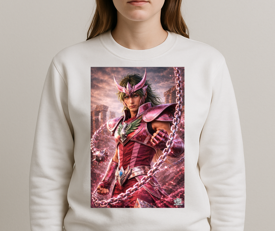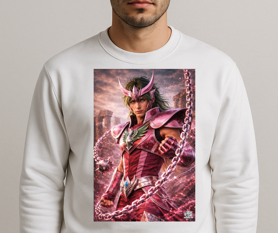 Esta sudadera exclusiva de Artenime presenta una ilustración anime realista del caballero de Andrómeda, representado con un alto nivel de detalle artístico y una estética épica y elegante.