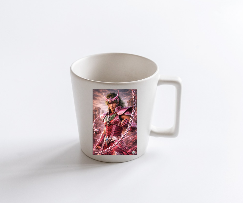 La taza de cerámica de Artenime luce una ilustración exclusiva inspirada en el caballero de Andrómeda, con un estilo anime realista y una presencia visual elegante y poderosa.