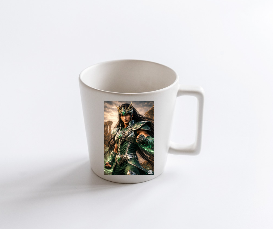 La taza de cerámica de Artenime luce una ilustración exclusiva inspirada en el caballero del Dragon, con un estilo anime realista y una presencia visual elegante y poderosa.